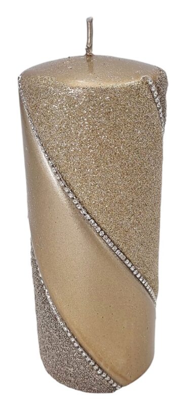 Świeca walec BOLERO 14cm szampańskie złoto Świeca z diamencikowymi paskami dookoła to prawdziwy klejnot wśród dekoracji, który wprowadza do wnętrza elegancję i luksus. Wykonana z najwyższej jakości wosku, świeca ma klasyczny, cylindryczny kształt, który doskonale komponuje się z różnymi stylami …