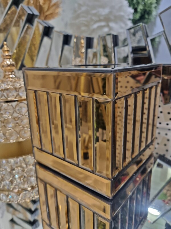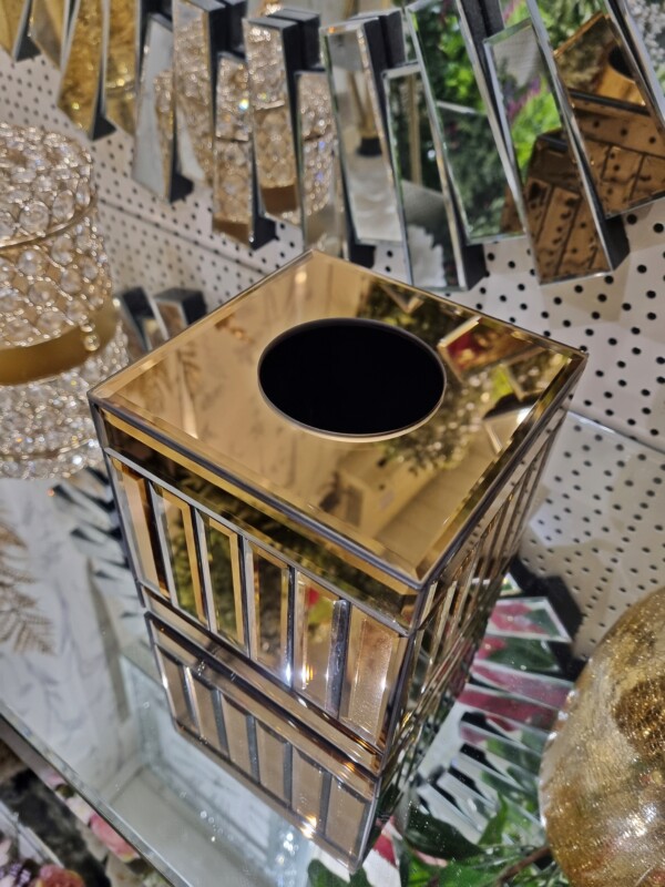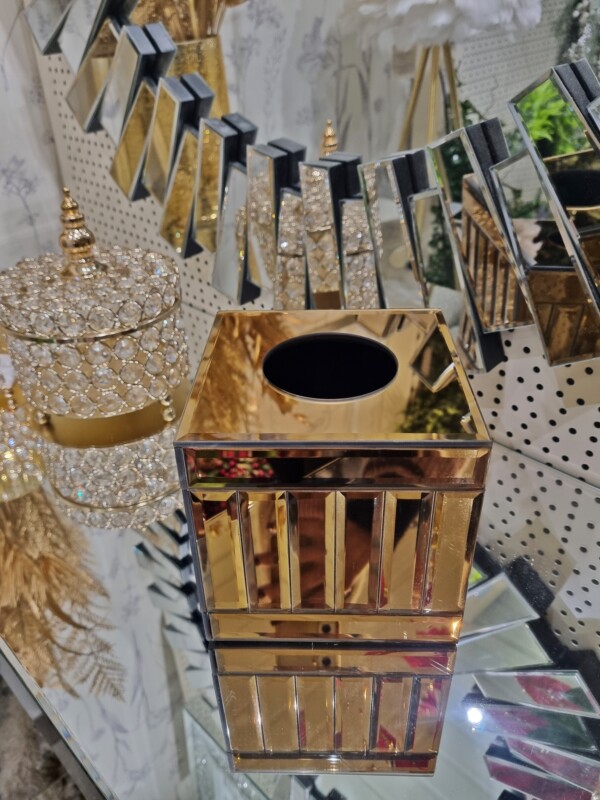 Chustecznik dekoracyjny glamour w eleganckim odcieniu brązowego złota to stylowy i funkcjonalny dodatek do wnętrz. Model posiada zdejmowaną górę z otworem, co ułatwia szybkie i wygodne uzupełnianie chusteczek (zmieści całe pudełko). Wnętrze wykonane jest z płyty MDF, zapewniającej stabilność oraz trwałość użytkowania.