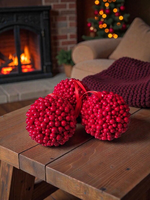 Elegancka świąteczna zawieszka w kształcie kuli wykonana z drobnych, połyskujących czerwonych kuleczek, które tworzą efektowną, fakturowaną powierzchnię. Dzięki intensywnej barwie i trójwymiarowej strukturze ozdoba pięknie przyciąga uwagę i dodaje aranżacjom wyjątkowego, świątecznego charakteru.