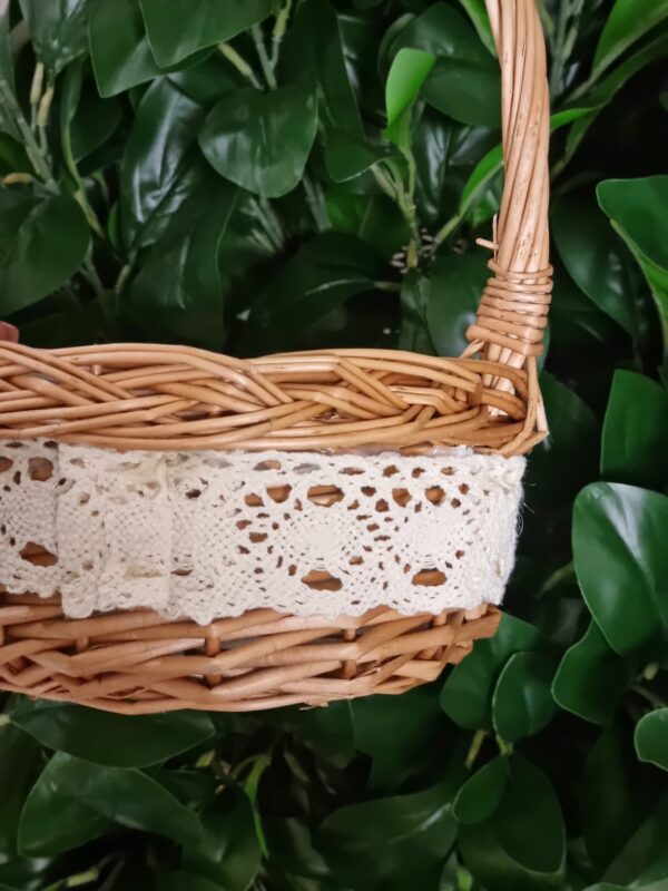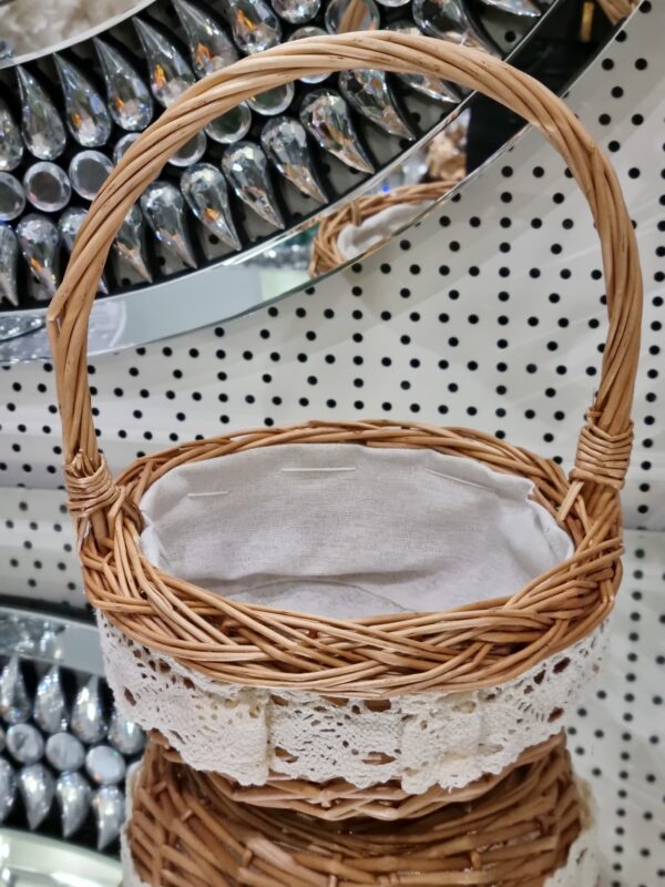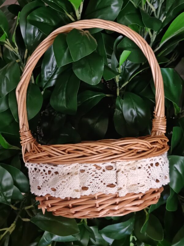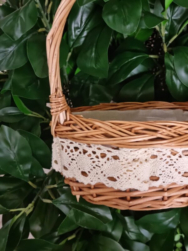Elegancki koszyczek dekoracyjny wykonany z naturalnej plecionki, który zachwyca swoim subtelnym i romantycznym wyglądem. Wyjątkowego charakteru nadaje mu zdobienie szydełkową koronką z włóczki, dzięki któremu koszyczek prezentuje się bardzo stylowo i efektownie. Wnętrze koszyczka zostało wyłożone materiałowym wkładem ochronnym, która zabezpiecza zawartość oraz ułatwia utrzymanie koszyka w czystości.