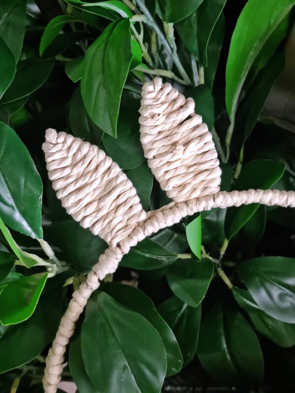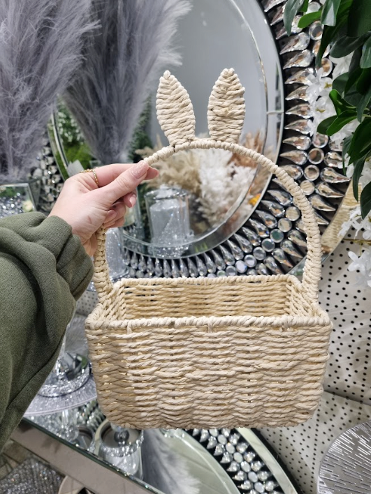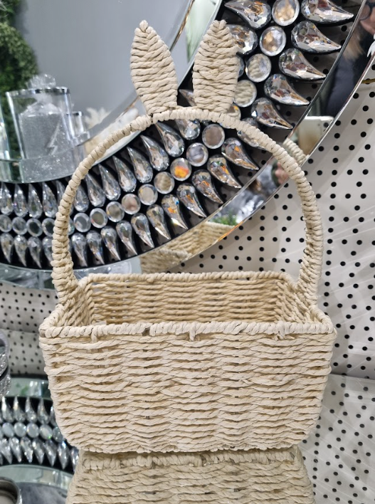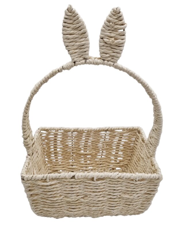Uroczy koszyczek dekoracyjny wykonany z naturalnego włókna roślinnego, który doskonale sprawdzi się jako ozdoba wielkanocna, koszyczek na święconkę lub element wiosennej aranżacji wnętrza. Jego wyjątkowym elementem jest rączka zakończona uszami zajączka, która nadaje mu oryginalnego, świątecznego charakteru.