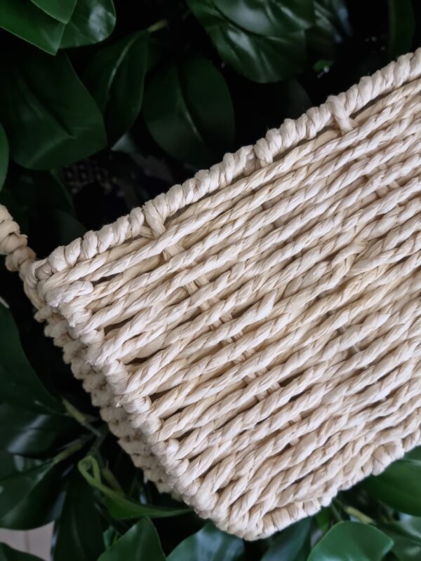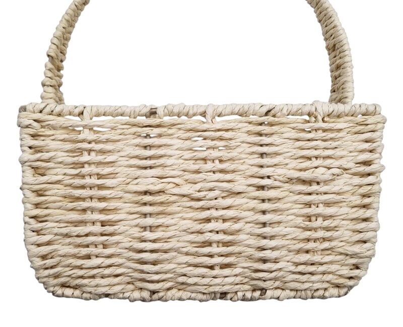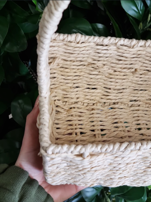 Koszyczek został ręcznie pleciony z włókna roślinnego – naturalnego materiału pozyskiwanego z roślin (np. trawy morskiej, papierowej wikliny lub podobnych włókien). Materiał ten jest lekki, ekologiczny, biodegradowalny i przyjazny środowisku, a jednocześnie trwały i estetyczny. Naturalna struktura włókna sprawia, że każdy koszyczek ma swój niepowtarzalny charakter.