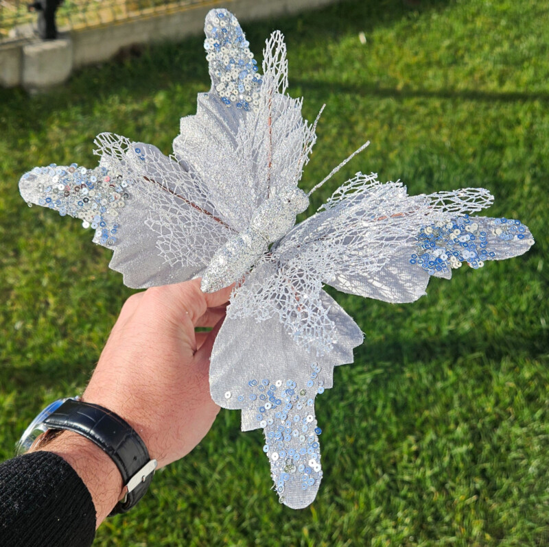 Kwiat wykonany z bardzo dobrej jakości materiału welurowego, miękkiego i przyjemnego w dotyku pokrytego pięknie mieniąca się brokatem.