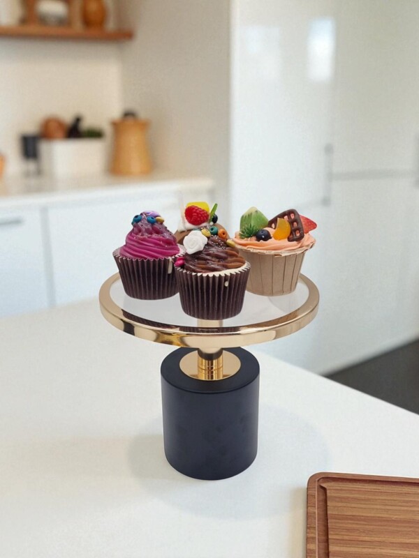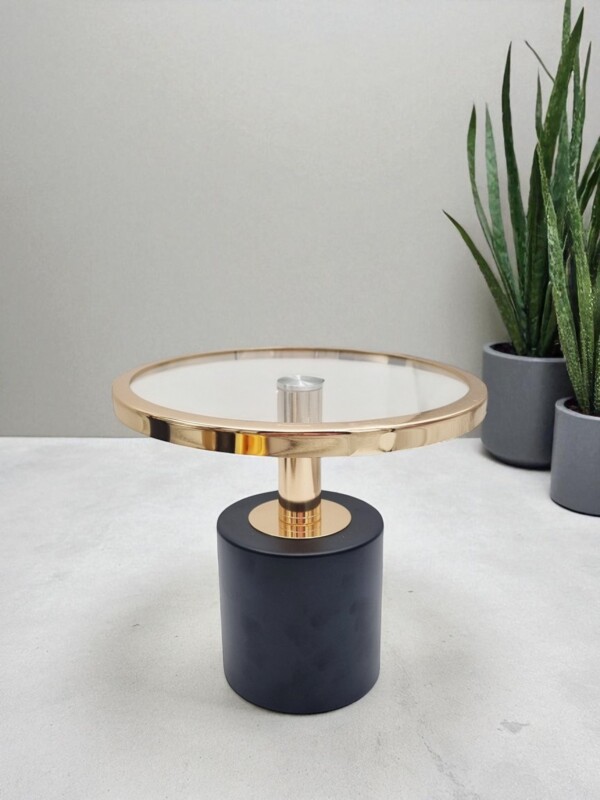 Stylowa patera wykonana z połączenia metalu i szkła to wyjątkowy dodatek do każdego stołu. Solidna, czarna podstawa w formie kuli nadaje jej stabilności i nowoczesnego charakteru, a złote wykończenie dodaje szyku i elegancji. Przezroczysta, szklana taca pięknie eksponuje słodkości, owoce czy przekąski.