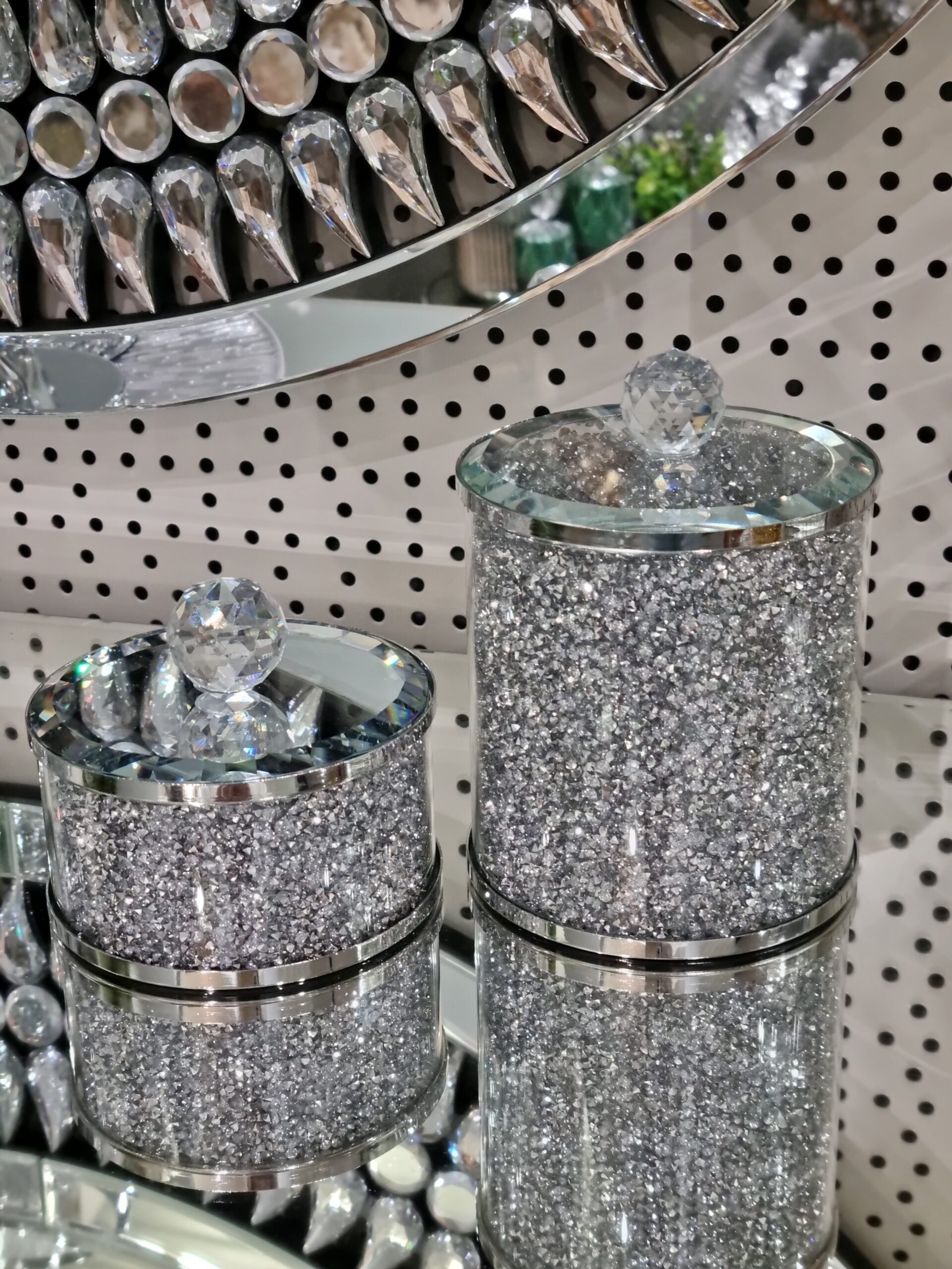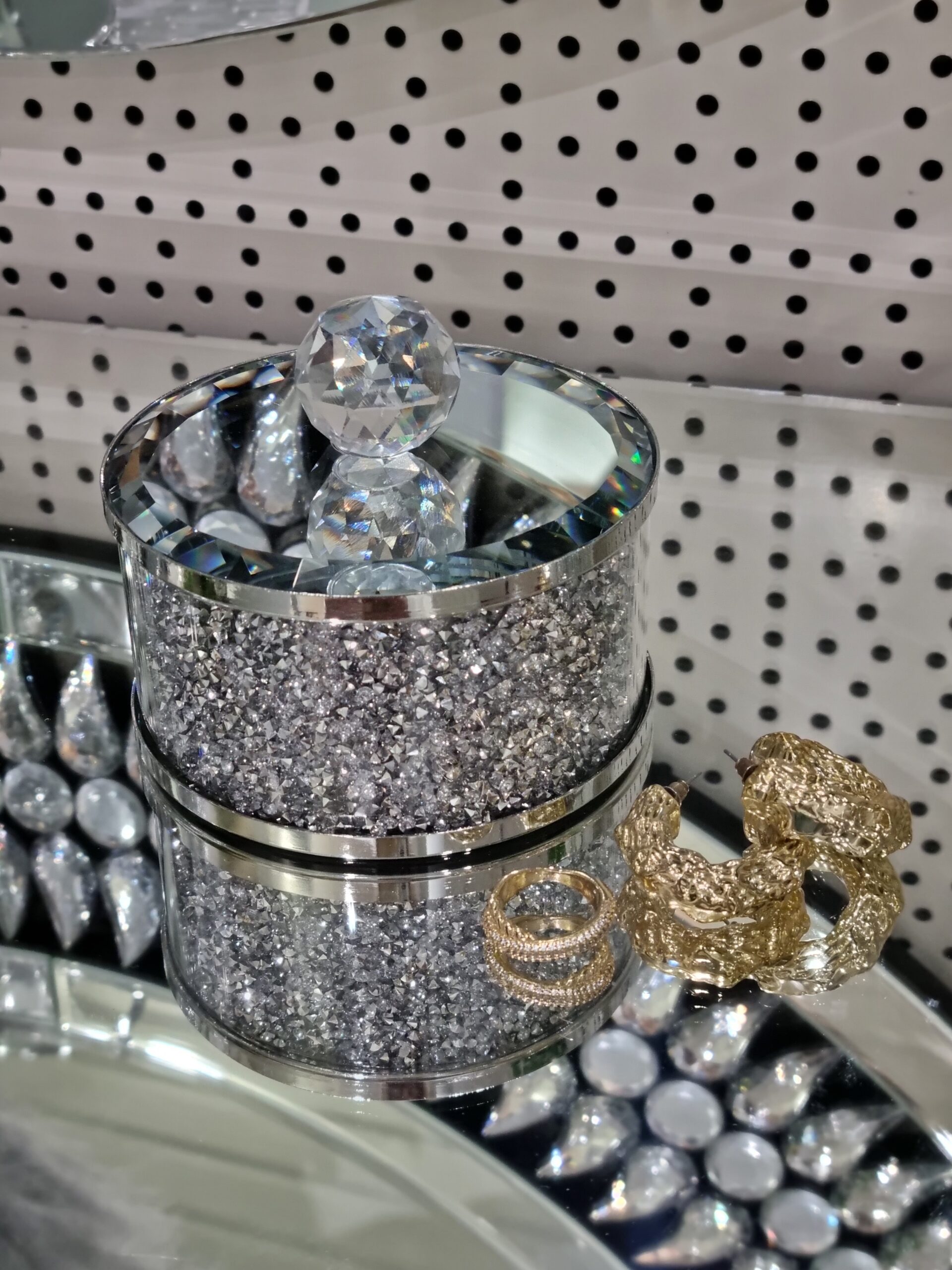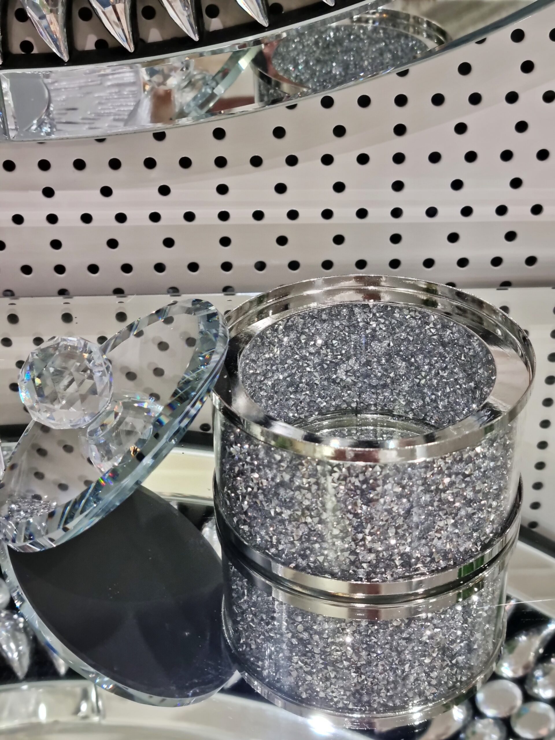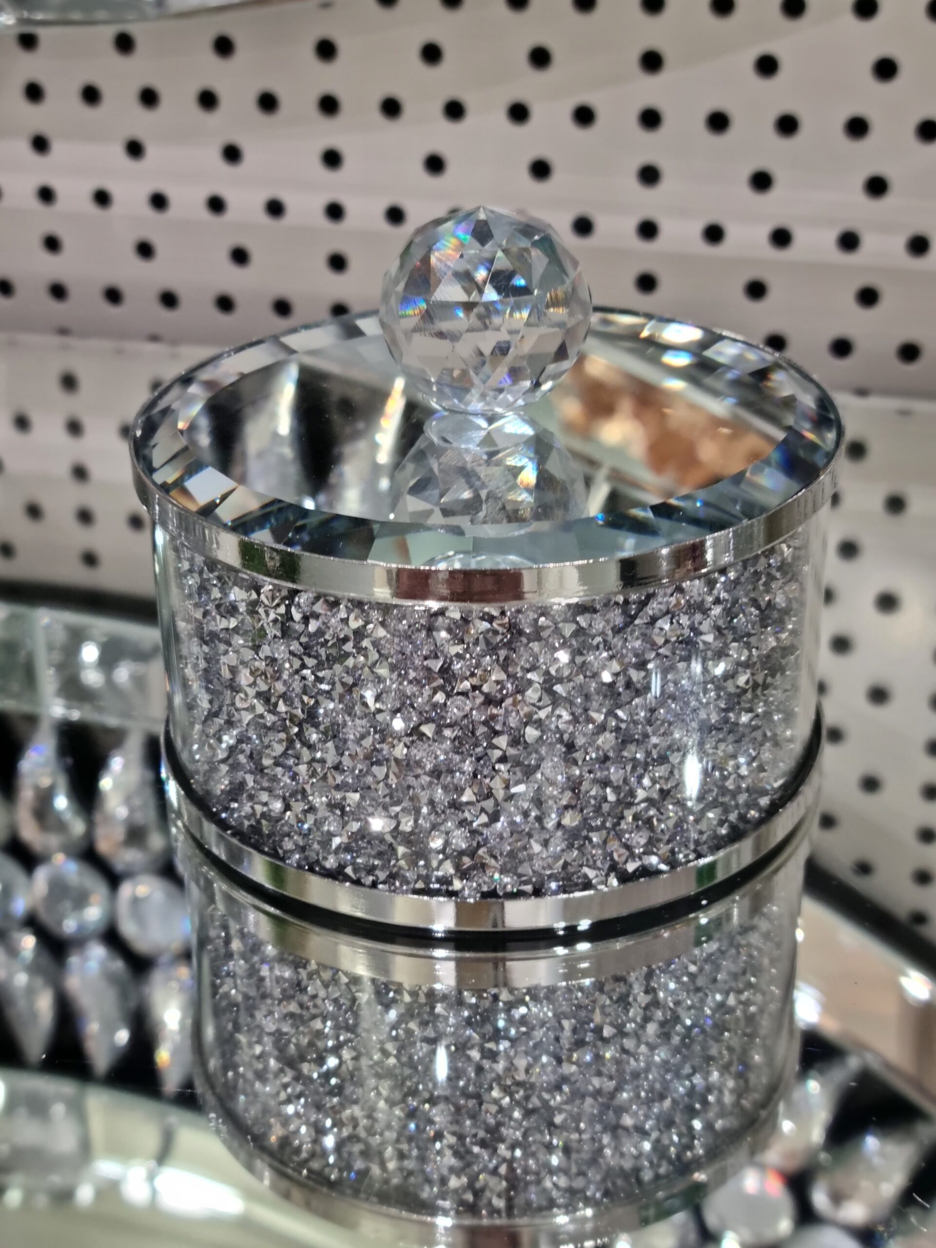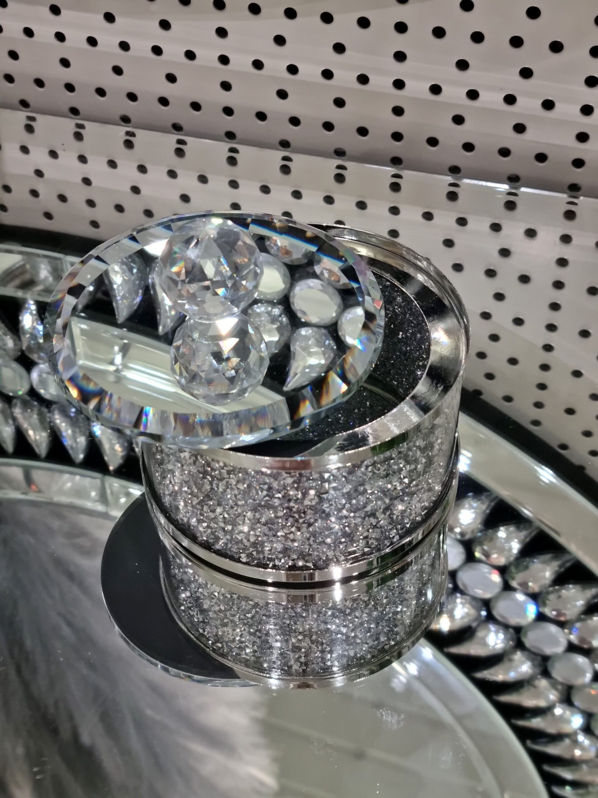 Materiał: szkło, metal, kryształki. Pokrywka lustrzana.