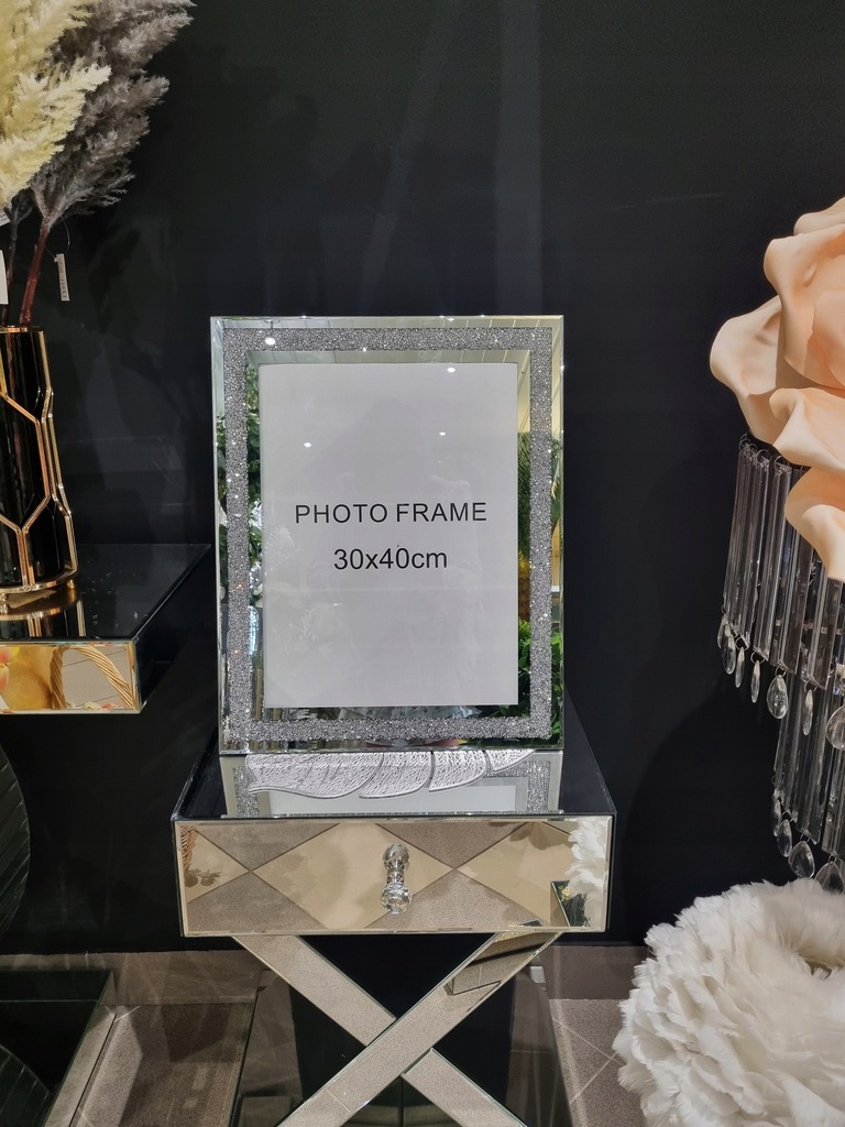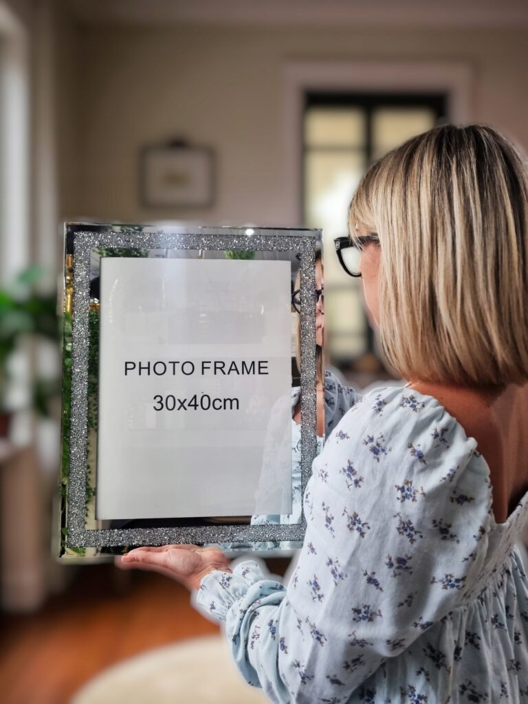 Szklana ramka wypełniona na rantach mieniącymi się drobnymi kryształkami.