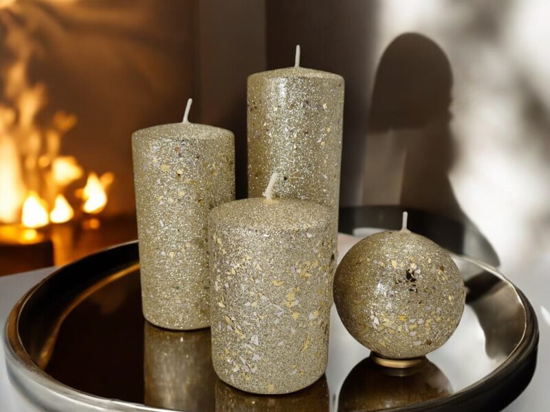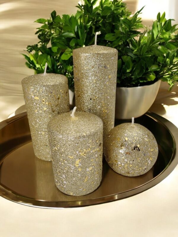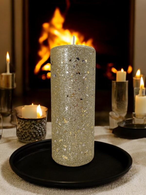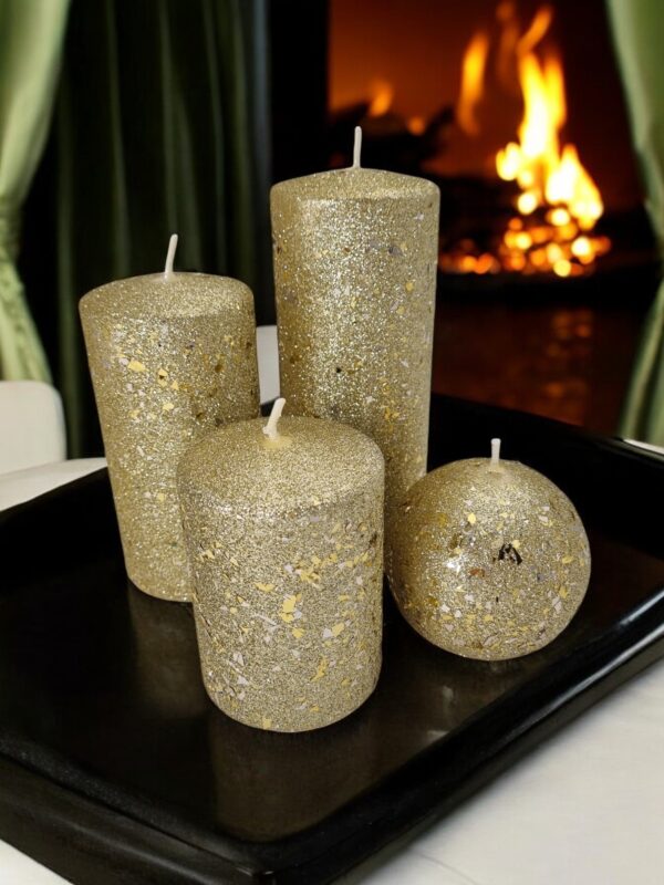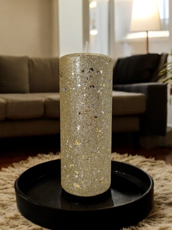 Powierzchnia świecy jest pokryta brokatem oraz drobinkami w kolorze złotym, które mienią się w świetle, tworząc efektowne refleksy i dodając całości wyrafinowanego wyglądu. Złote drobinki sprawiają, że świeca wygląda jak mały klejnot, który przyciąga wzrok i wprowadza do wnętrza odrobinę luksusu.