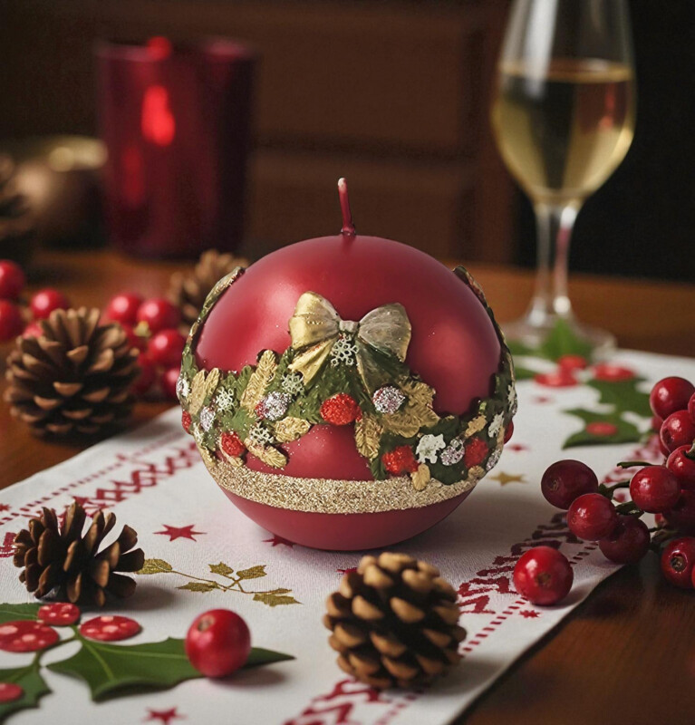 Świeczka świąteczna to wyjątkowy dodatek, który wprowadza magiczny nastrój do każdego wnętrza podczas świątecznego okresu. Ozdobiona jest efektowną, trójwymiarową girlandą z motywami świątecznymi – złotą kokardą, zielonymi gałązkami oraz połyskującymi czerwonymi i srebrnymi akcentami. . Stanowi nie tylko źródło światła, ale również elegancki element dekoracyjny.