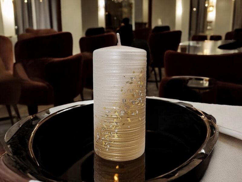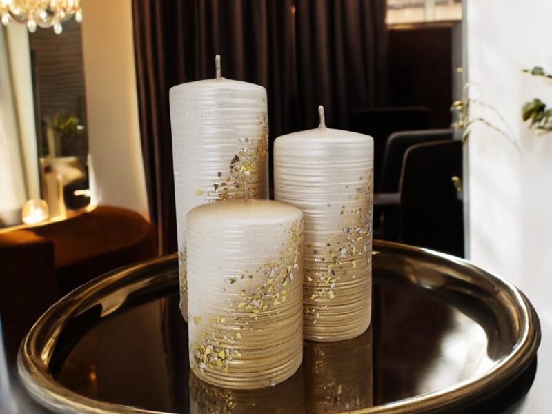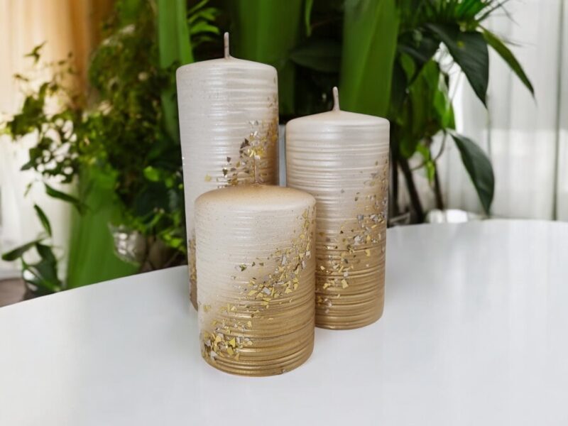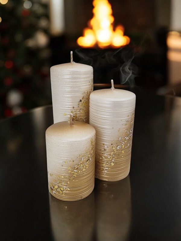 Powierzchnia świecy jest pokryta delikatnym brokatem oraz drobinkami w kolorze złotym, które mienią się w świetle, tworząc efektowne refleksy i dodając całości wyrafinowanego wyglądu. Złote drobinki sprawiają, że świeca wygląda jak mały klejnot, który przyciąga wzrok i wprowadza do wnętrza odrobinę luksusu.