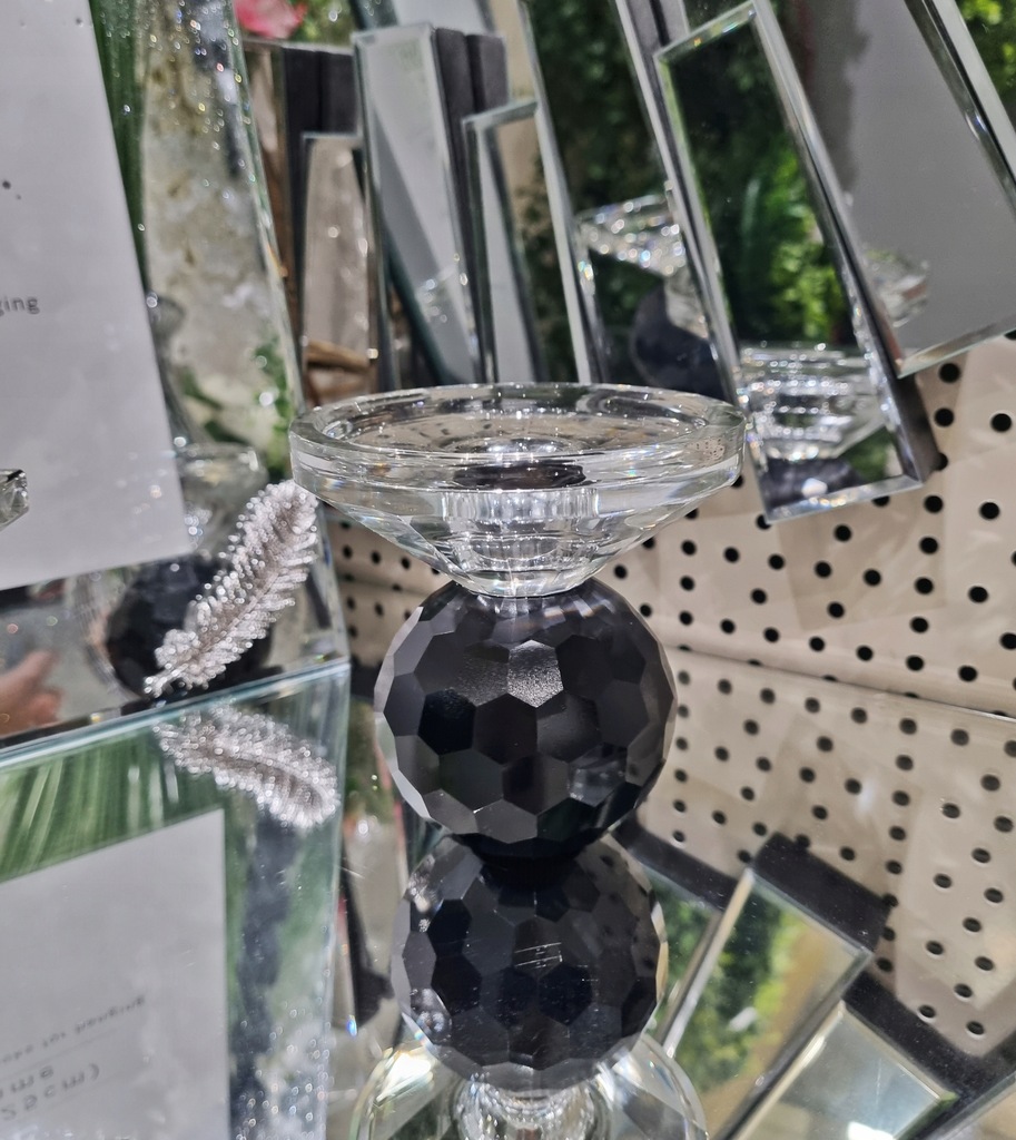 Oferuję wyjątkowy świecznik wykonany z wysokiej jakości szkła. Jego oryginalny design łączy przejrzystą, geometryczną podstawę z czarną, fasetowaną kulą, co nadaje całości nowoczesny i luksusowy charakter.