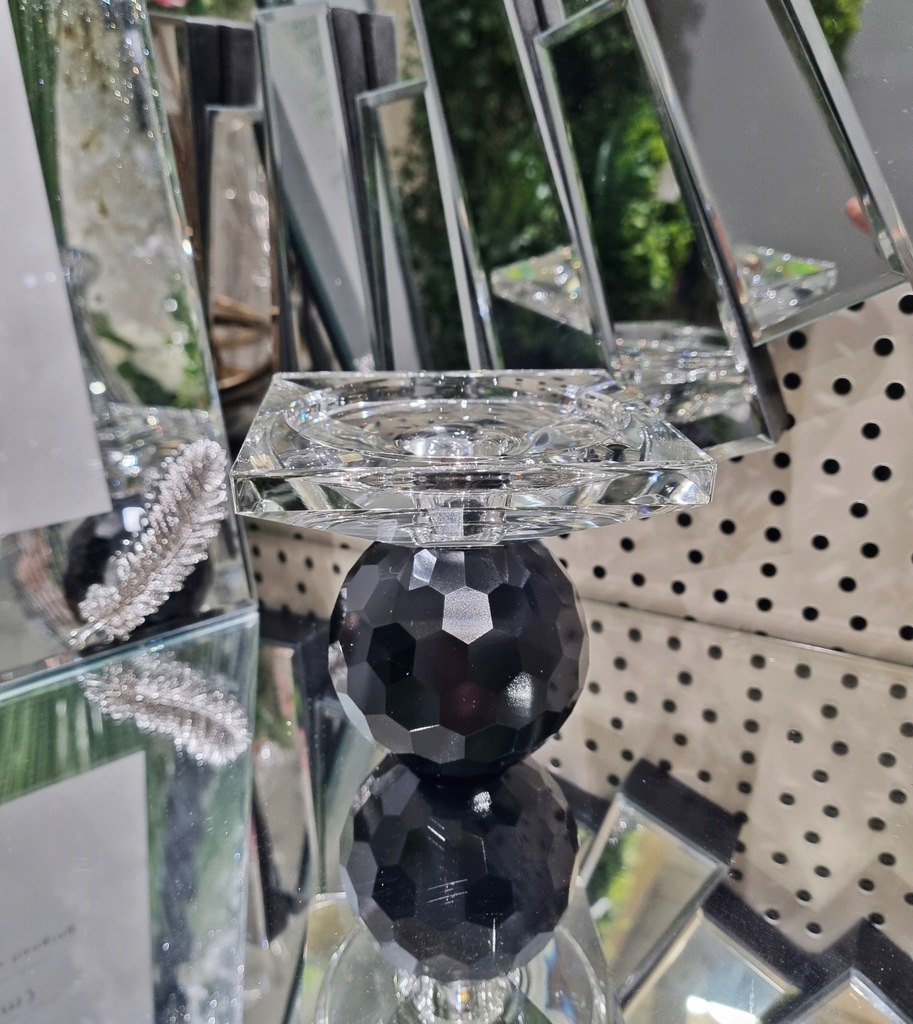 Oferuję wyjątkowy świecznik wykonany z wysokiej jakości szkła. Jego oryginalny design łączy przejrzystą, geometryczną podstawę z czarną, fasetowaną kulą, co nadaje całości nowoczesny i luksusowy charakter.
