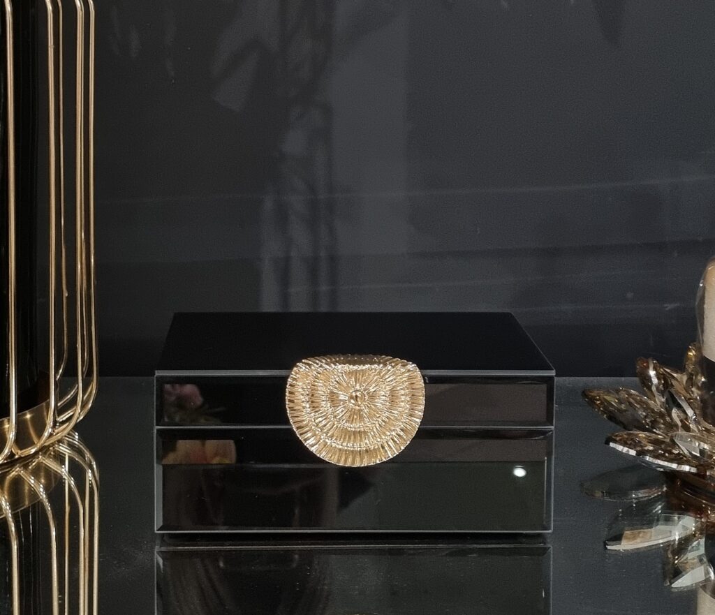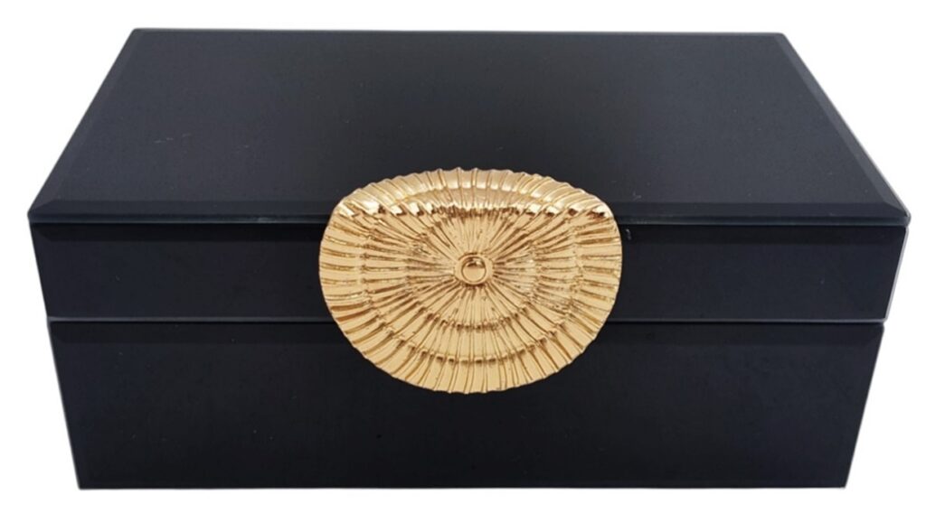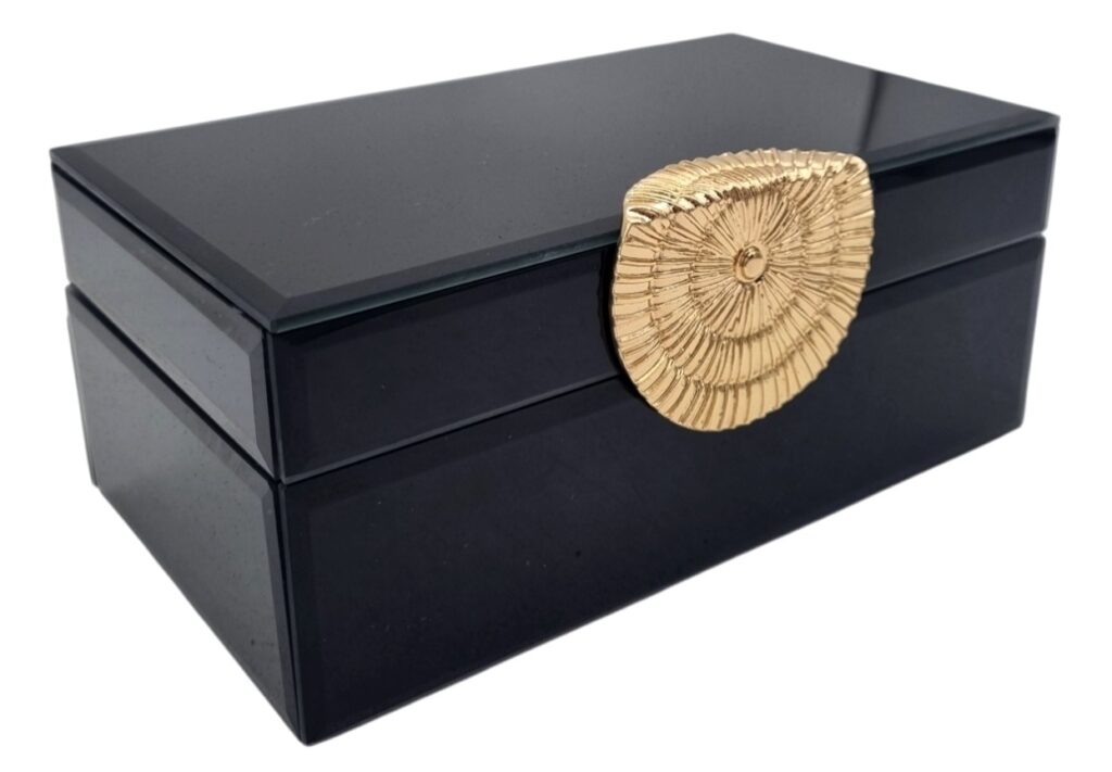 Na sprzedaż wyjątkowe, eleganckie pudełko w kolorze głębokiej czerni, ozdobione efektownym złotym detalem w kształcie muszli. Doskonale sprawdzi się jako: