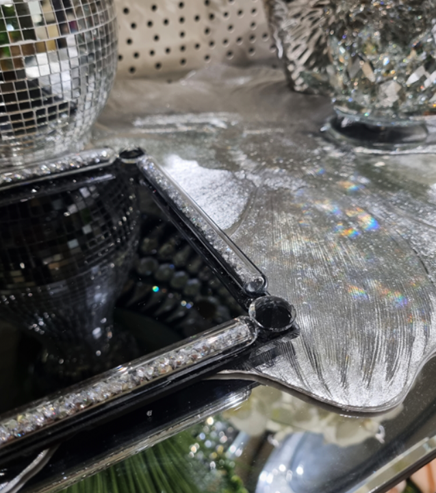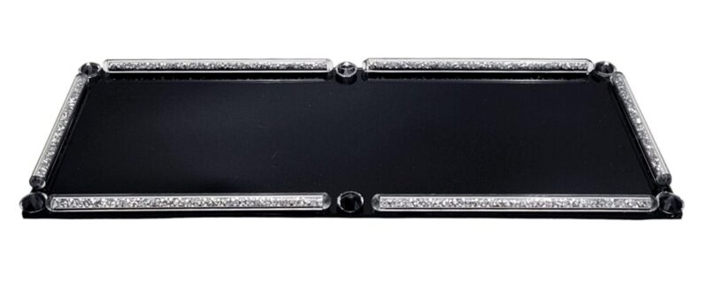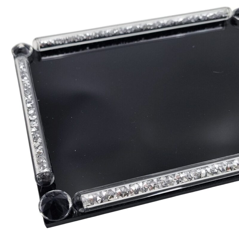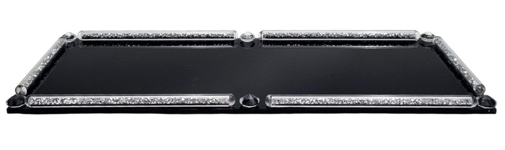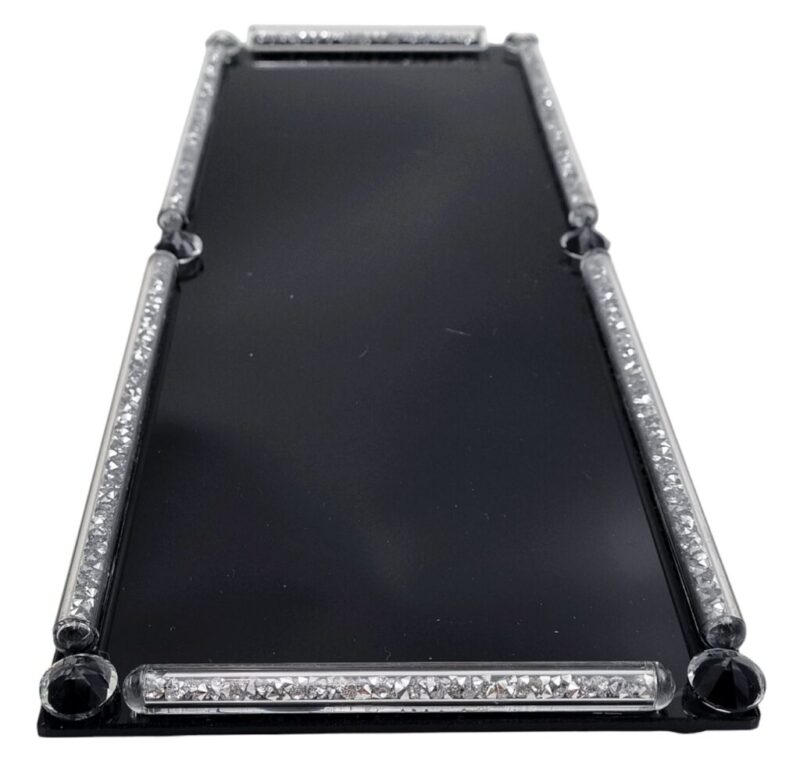 Lustrzana taca w kolorze czarnym, brzegi wypełnione drobnymi mieniącymi się kryształkami w kolorze srebrnym.