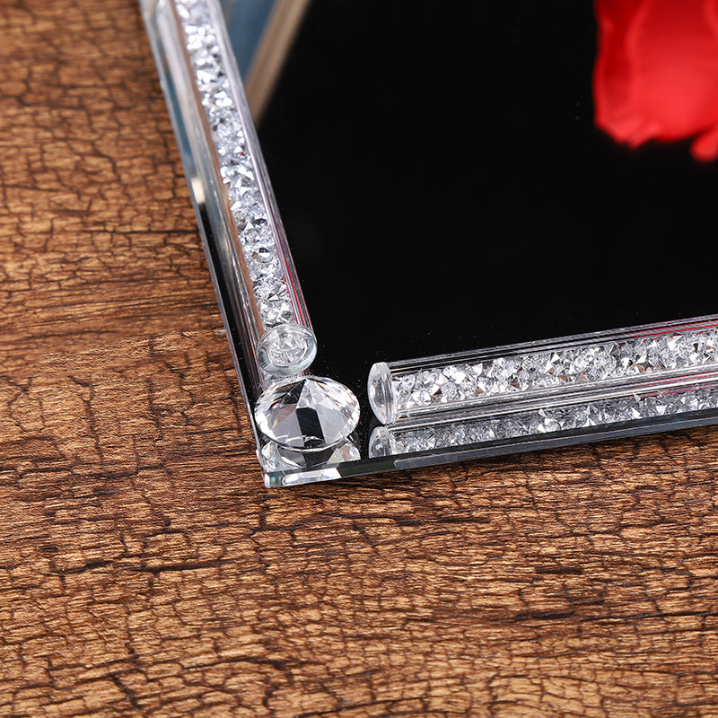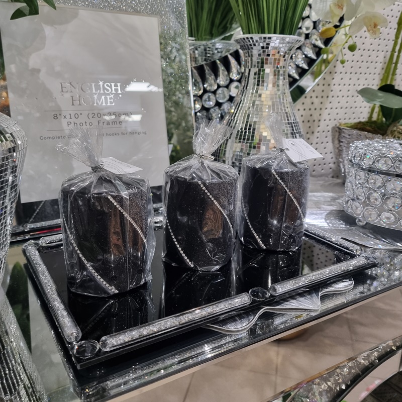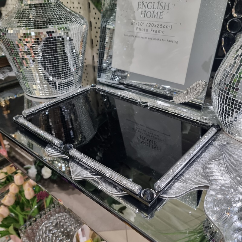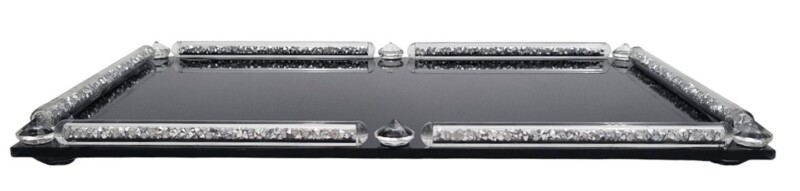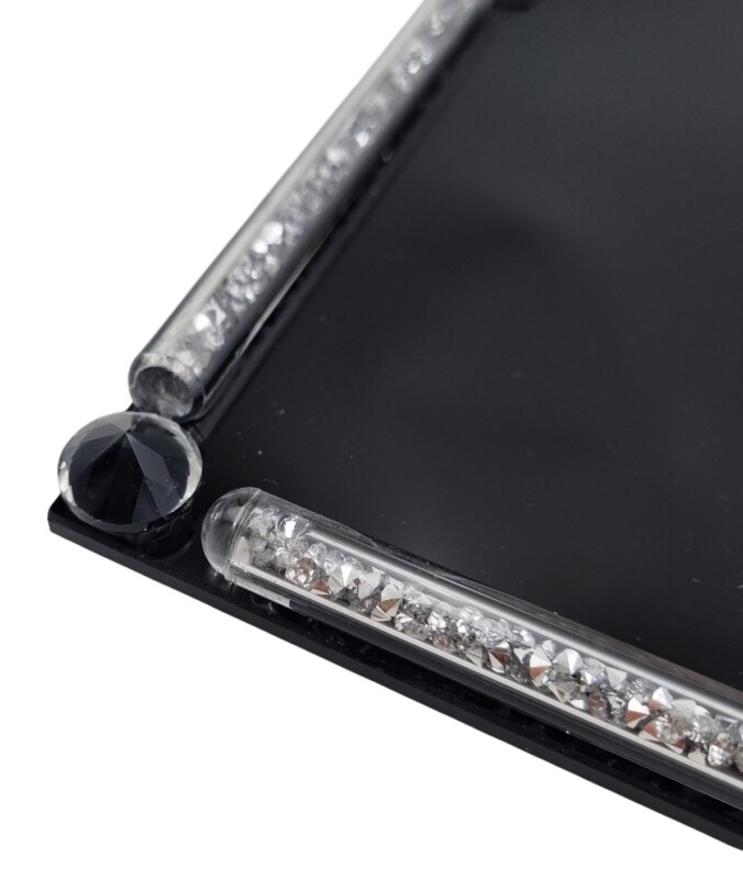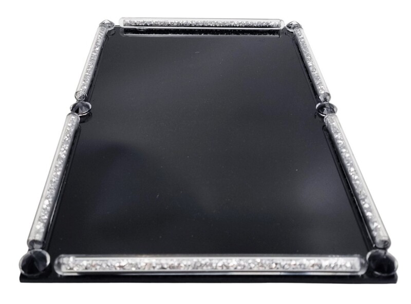 Lustrzana taca w kolorze czarnym, brzegi wypełnione drobnymi mieniącymi się kryształkami w kolorze srebrnym.