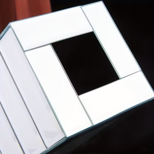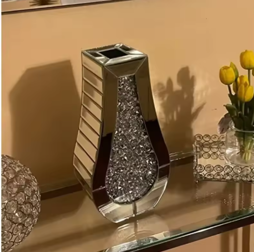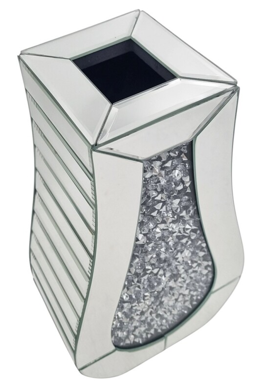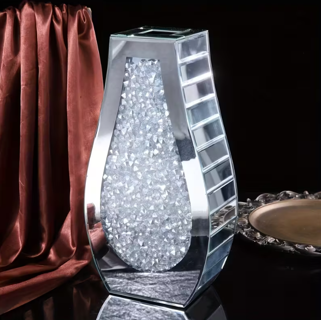 Wazon wykonany jest głównie ze szkła lustrzanego oraz ozdobnych kryształków umieszczonych w centralnej części. Konstrukcja opiera się na szklanych panelach z efektem lustra, a dekoracyjne wypełnienie imituje prawdziwe kryształy, dzięki czemu całość wygląda luksusowo i połyskuje w świetle.