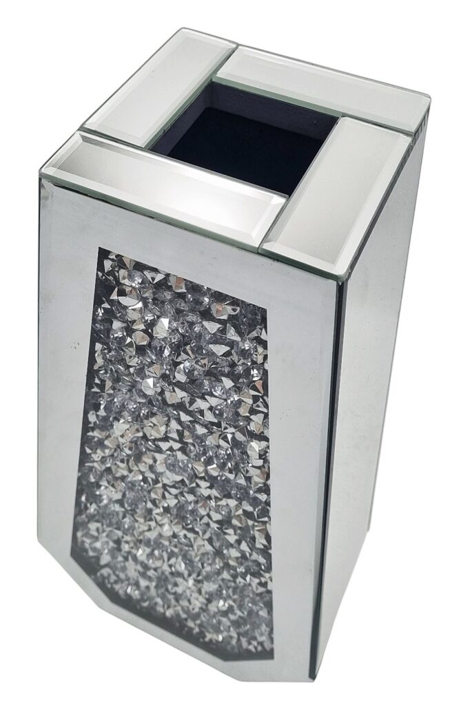 Wazon wspaniale sprawdzi się w luksusowych wnętrzach, salonach w stylu glamour czy też New York. Dzięki lustrzanym powierzchniom i kryształowym zdobieniom pięknie odbija światło i dodaje pomieszczeniu blasku.