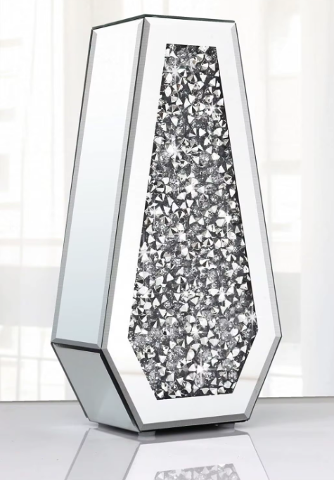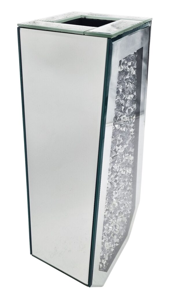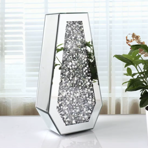 Wazon wykonany jest głównie ze szkła lustrzanego oraz ozdobnych kryształków umieszczonych w centralnej części. Konstrukcja opiera się na szklanych panelach z efektem lustra, a dekoracyjne wypełnienie imituje prawdziwe kryształy, dzięki czemu całość wygląda luksusowo i połyskuje w świetle.