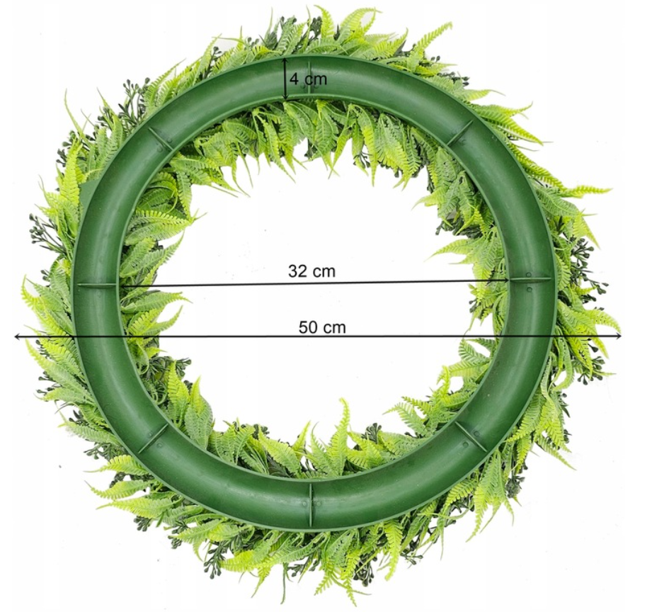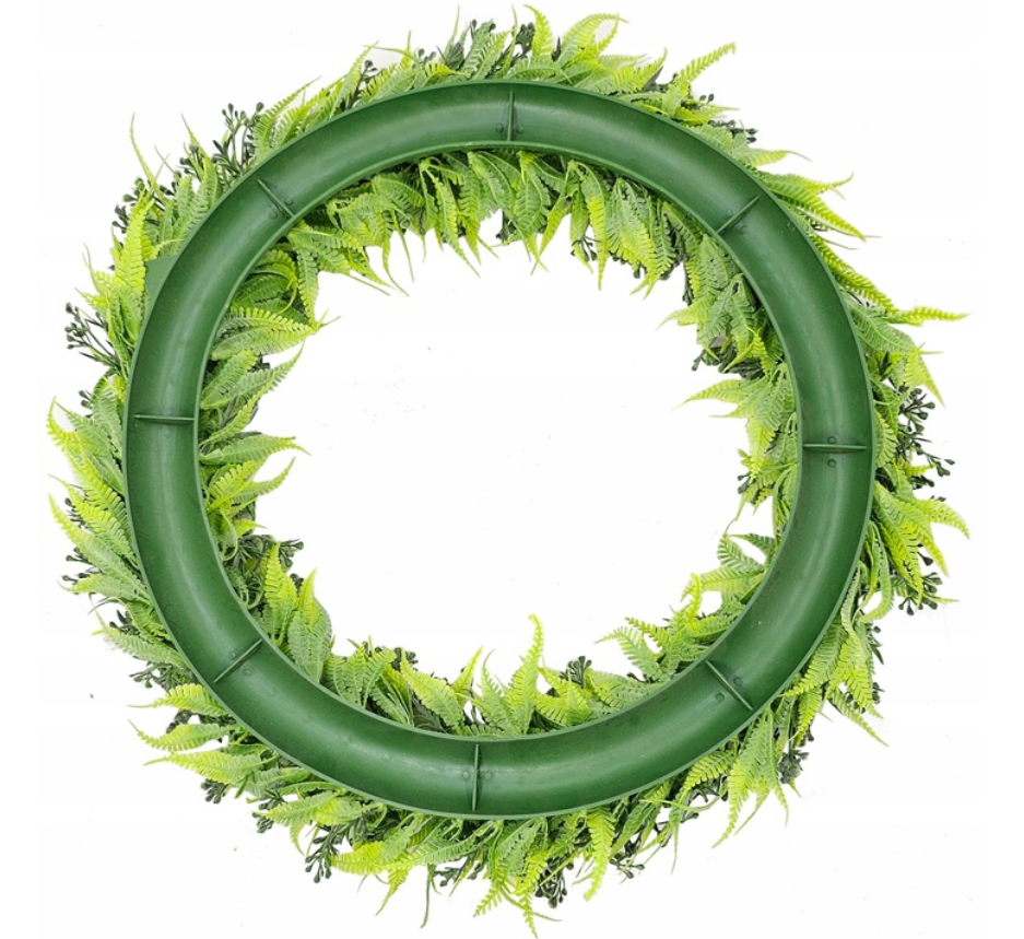 Dekoracyjny zielony wianek – sztuczna roślina. Doskonały do wszelkiego rodzaju aranżacji. Można go łączyć z figurkami, lampionami, świecznikami. Pięknie ozdobi stół, okno, drzwi, komodę.