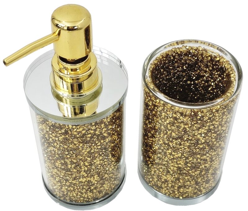 Szklany zestaw w stylu glamour składający się z dozownika na mydło lub płyn i kubka na szczoteczki.