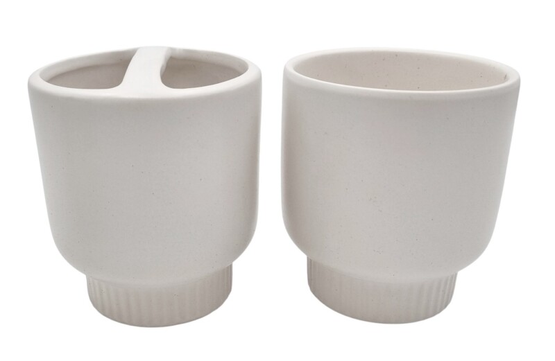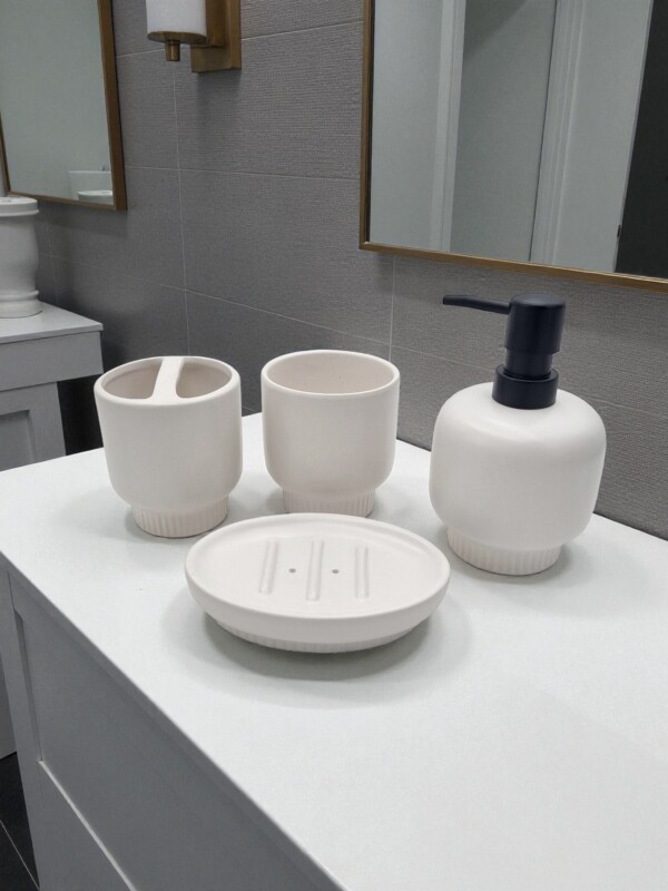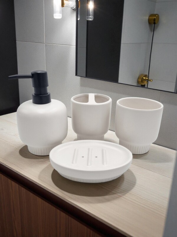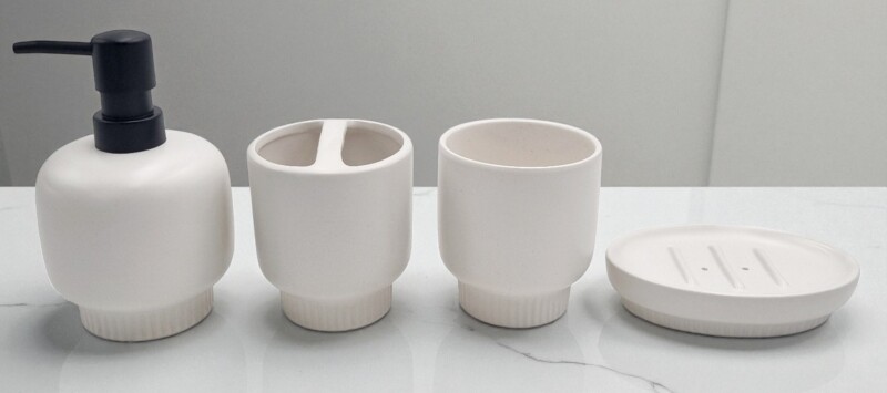 Zestaw składa się z dozownika do mydło w płynie, klasycznej mydelniczki na mydło w kostce, kubka i pojemnika na szczoteczki do zębów. W pojemniku na szczoteczki są oddzielne otwory pomagające utrzymać je w odpowiedniej czystości. Kubek sprawdzi się do przechowania pasty do zębów, golarki.