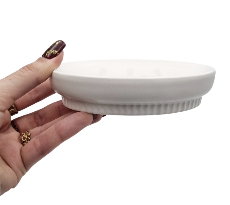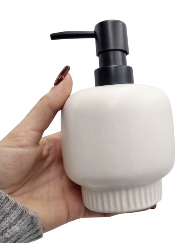 Praktyczny zestaw akcesoriów łazienkowych wykonany z ceramiki (jedynie dozownik plastik) utrzymanej w białej kolorystyce.