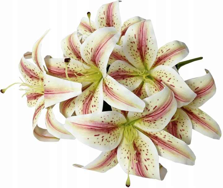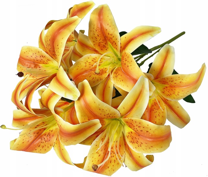 BUKIET LILII Bukiet składa się z 5 gałązek z czego dwie mają podwójne rozgałęzienia. Wysoka jakość wykonania sprawia, że kwiaty wyglądają bardzo naturalnie. Wysokość bukietu – 60 cm Ilość gałązek – 5 szt Ilość lilii – 7 sztuk Średnica lilii …