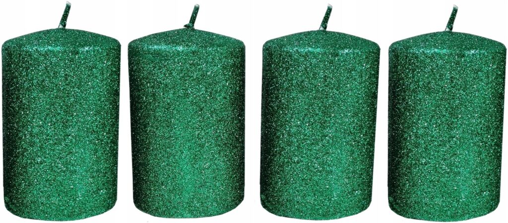 Świece 4-pack brokat zieleń Świeca brokatowe, pięknie błyszczące, które nadają jej nowoczesnego i eleganckiego wyglądu. Idealne do dekoracji salonu jak i do użytku przy stroikach i wiankach. Świece wykonane są z surowców posiadających wszelkie wymagane certyfikaty bezpieczeństwa i jakości. Świece …
