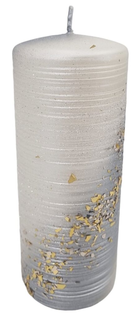 Świeca walec STARDUST 17,5cm biało-srebrna z drobinkami złota