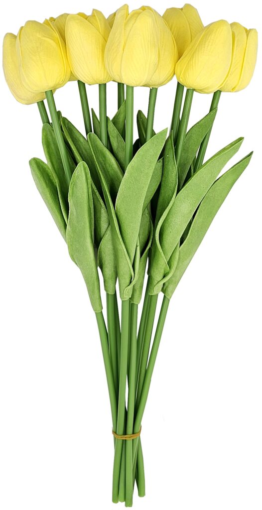 Bukiet Tulipanów Silikonowych 10 sztuk Bukiet składa się z 10 pojedynczych gałązek. Każda łodyga posiada dwa listki wykonane z pianki oraz pąk kwiatowy wykonany z pianki. Wymiary: Wysokość główki: 5cm. Wysokość całkowita: 34cm. Piękny wiosenny kolor: Kolor żółty wnosi do pomieszczenia …